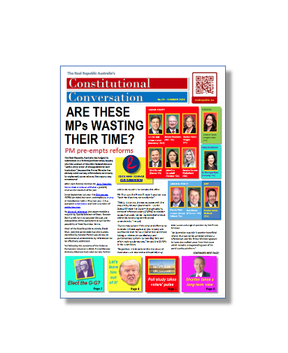 The Real Republic Australia publishes the CONSTITUTIONAL CONVERSATION newsletter to help promote public debate on the concept of an Australian republic with a directly elected Head of State as well as other beneficial constitutional reforms.